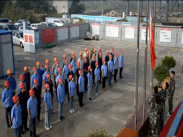 接著,淮河水科院項目部全體員工面對莊嚴的國旗鄭重宣誓。一句句擲地有聲的誓詞,不僅展現了項目部全體員工的精神面貌,更體現出蚌埠分公司“干一個工程,樹一個精品”的決心。