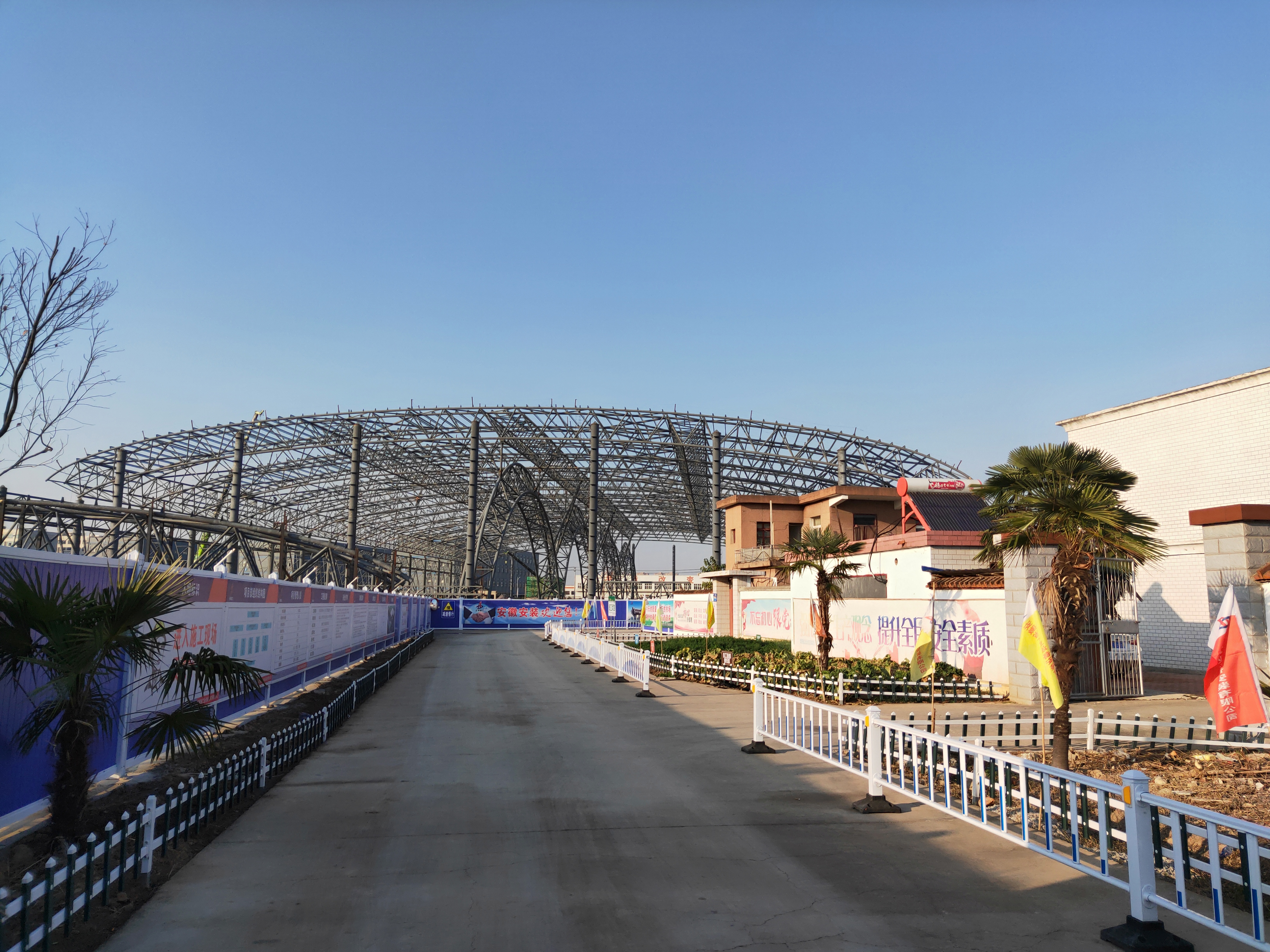 該項目主要施工內容為新建水工河工模型試驗鋼結構及附屬土建工程,建筑面積約20000㎡,結構形式為排架柱(圓鋼管)+三肢管桁架結構,構件高度24米,跨度97.6米(單跨跨度為48.8米),抗震設防烈度為7度,為目前安徽省建設第二大跨度的鋼結構工程。