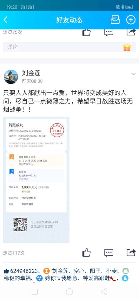 她就是寧夏辦事處職工劉金蓮?fù)尽⒔鹕復(fù)驹诠ぷ髦姓J(rèn)真積極,是一名陽(yáng)光樂(lè)觀、任勞任怨的優(yōu)秀員工,她在平時(shí)生活工作中也總是積極主動(dòng)的幫助他人。在這次疫情爆發(fā)后,2月13日,劉金蓮?fù)局鲃?dòng)聯(lián)系當(dāng)?shù)馗拭C省臨澤縣紅十字會(huì),通過(guò)線上微信轉(zhuǎn)賬的方式,轉(zhuǎn)給紅十字會(huì)捐款人民幣1000元。接下來(lái),她又主動(dòng)聯(lián)系當(dāng)?shù)丶t十字會(huì)工作人員,要求主動(dòng)擔(dān)當(dāng)志愿者,但是因?yàn)榭陀^原因,沒(méi)有被批準(zhǔn)。
