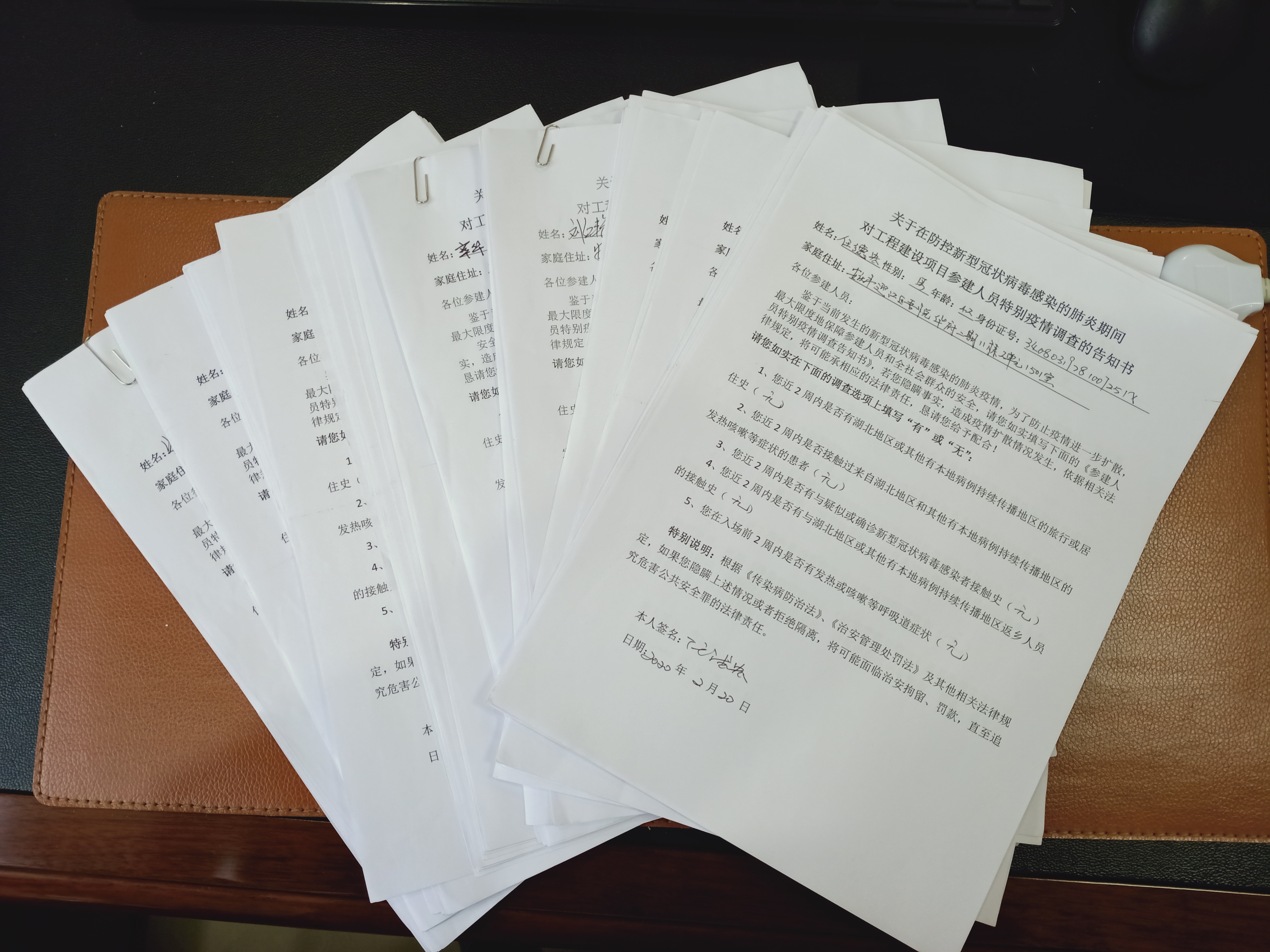 為了解疫情防控期間員工真實出行和健康情況,項目部組織員工通過運營商“漫游地查詢”公益服務和每日健康打卡獲取最近30日出行軌跡和每日健康狀況,要求員工簽署疫情防控告知書。確保無死角、全覆蓋,嚴把人員輸入關,從源頭上消滅安全隱患因素。