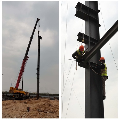 伴隨著隆隆的吊車轟鳴聲,閃爍的電焊火花,縱橫交錯的鋼構(gòu)架拼裝,一道道工序正在有條不紊的進(jìn)行著……這是走進(jìn)蕪湖宇培年產(chǎn)50萬方建筑工業(yè)化構(gòu)件生產(chǎn)基地項(xiàng)目鋼結(jié)構(gòu)工程,看到的一片繁忙施工景象。因受疫情的影響,項(xiàng)目部2020年3月5日接到總包的復(fù)工復(fù)產(chǎn)通知,3月6日立即組織召開復(fù)工會議,全面部署“防疫”舉措和生產(chǎn)任務(wù)。在做好施工必備的人、材、機(jī)進(jìn)場和安全教育及技術(shù)交底后,3月11日,當(dāng)?shù)谝桓?7米高的廠房跨立柱穩(wěn)穩(wěn)地吊裝成功后,項(xiàng)目部全面啟動,按下?lián)尮ぁ翱爝M(jìn)鍵”。