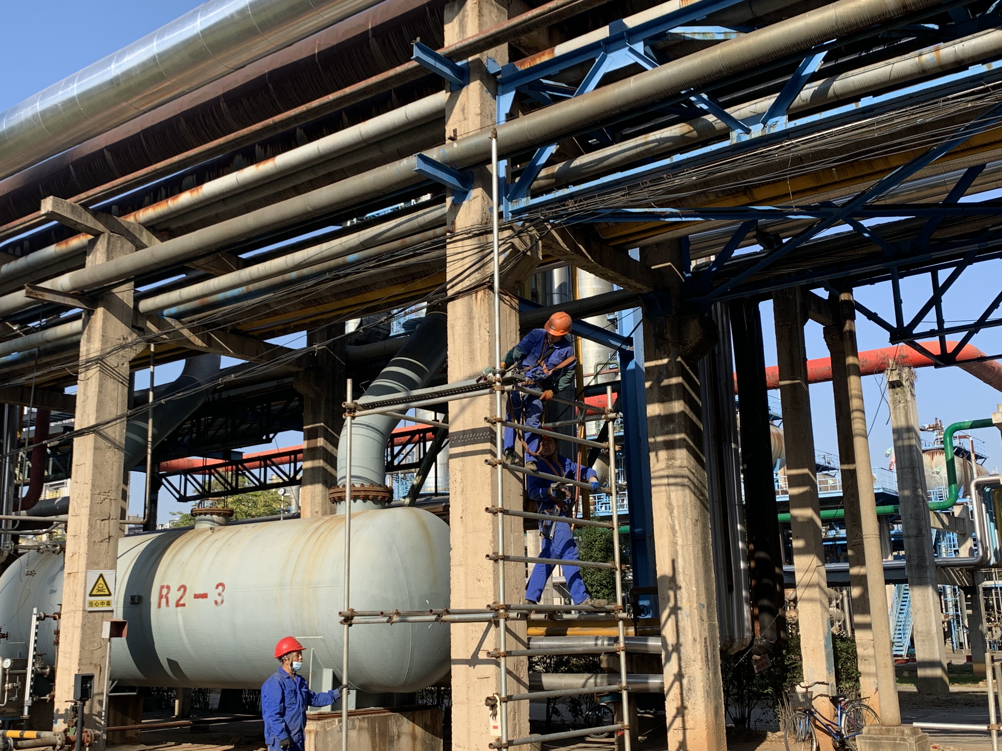 安慶石化低二腈線隱患處理項目在茅青路液化氣罐路口低Ⅱ線分支起至腈綸西圍墻內(nèi)界區(qū),對原有管道拆除換新。目前施工各項工作均已完成并驗收,相關(guān)作業(yè)物資已經(jīng)清理完畢,做好拆除腳手架前的各項準(zhǔn)備,按自上而下先裝者后拆,后裝者先拆,逐步拆除,一步一清。