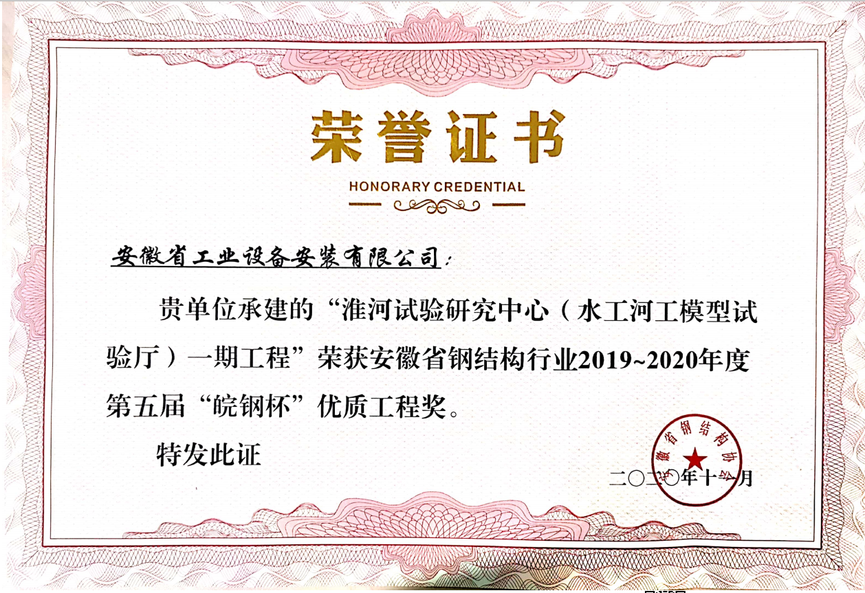 安徽安裝公司淮河試驗研究中心(水工河工模型試驗廳)一期工程榮獲“皖鋼杯”優質工程