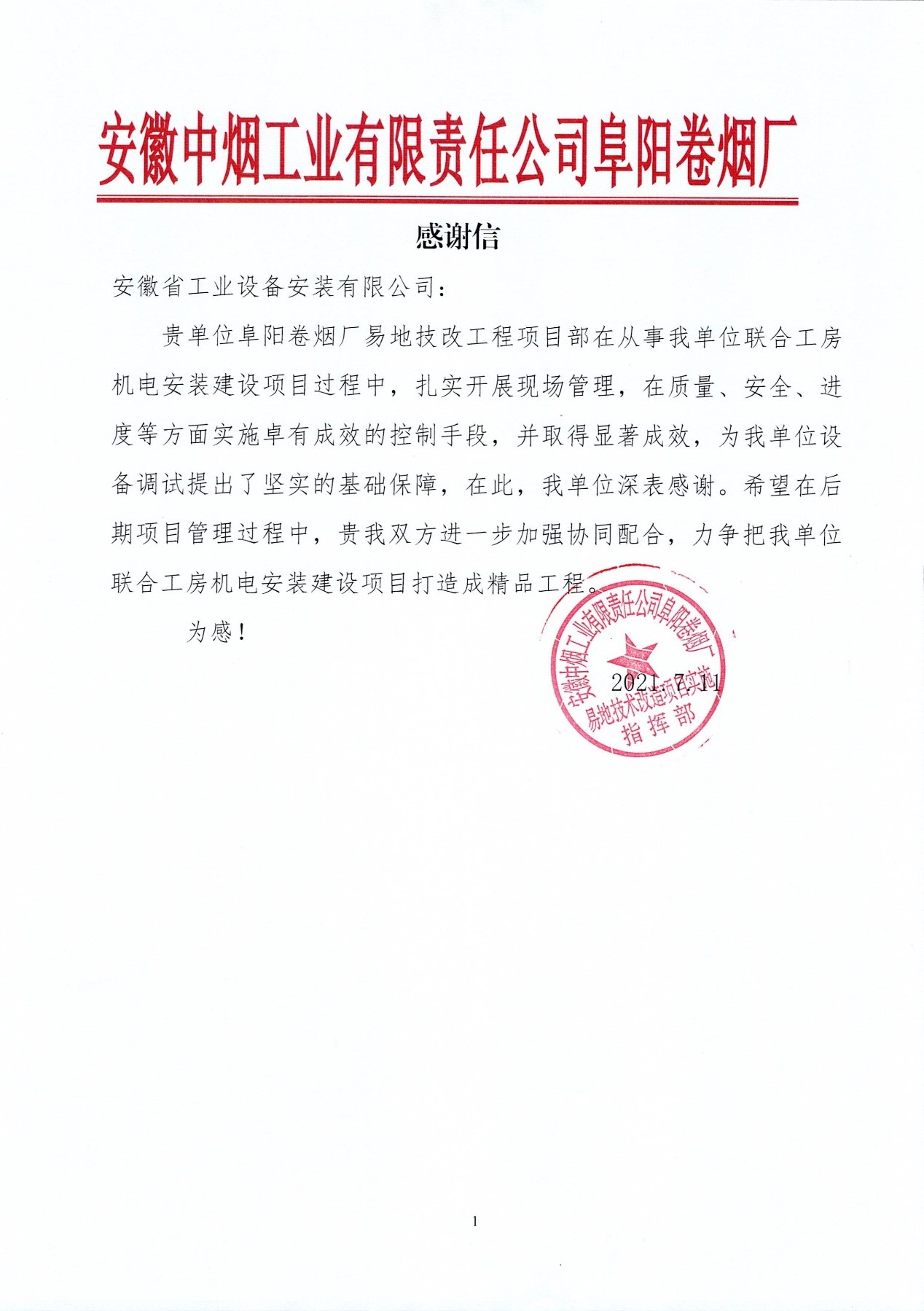 7月11日下午,安徽安裝蚌埠分公司收到安徽中煙阜陽卷煙廠發來的感謝信。信中對安徽安裝蚌埠分公司承建的聯合工房機電安裝項目表達了充分認可和高度贊譽。