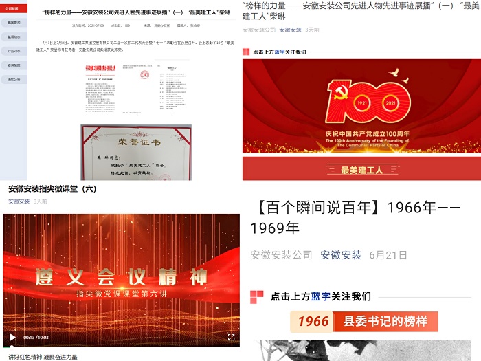 公司黨委第一時間編印專刊宣傳板報下發至所屬各單位和基層項目一線,用好企業網站、微信公眾號、電子屏、宣傳欄和所屬各單位、各項目部所有宣傳陣地,在公司網站、微信公眾號先后開設“百個瞬間說百年”“黨史學習教育專欄系列報道”“榜樣的力量——安徽安裝公司先進人物先進事跡展播”“記錄奮進力量—安徽安裝公司基層一線事跡展播”等專欄進行專題宣傳,大力營造“學習黨史有熱情,干事創業有激情”的良好氛圍,合肥分公司黨支部舉辦黨史學習教育主題攝影大賽,努力營造悟初心、守初心、踐初心的強大聲勢。