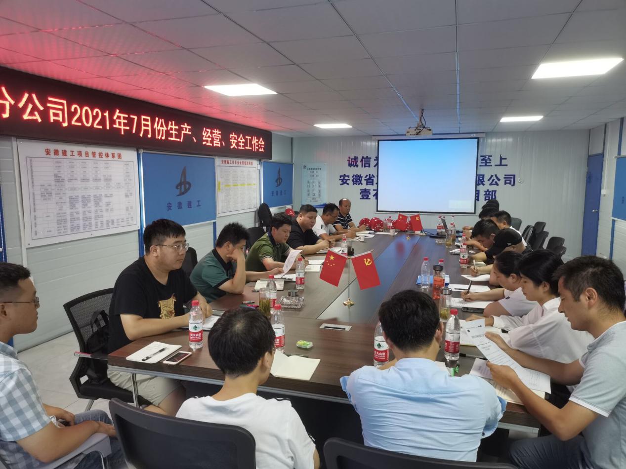 7月31日,房建(裝飾)分公司在定遠壹石通化學科技廠房項目部召開7月生產、安全、經營工作會議,分公司領導班子成員、所屬各項目班子成員、分公司機關各部門負責人以及工程部全體成員參加會議,會議由分公司副經理徐明東主持。