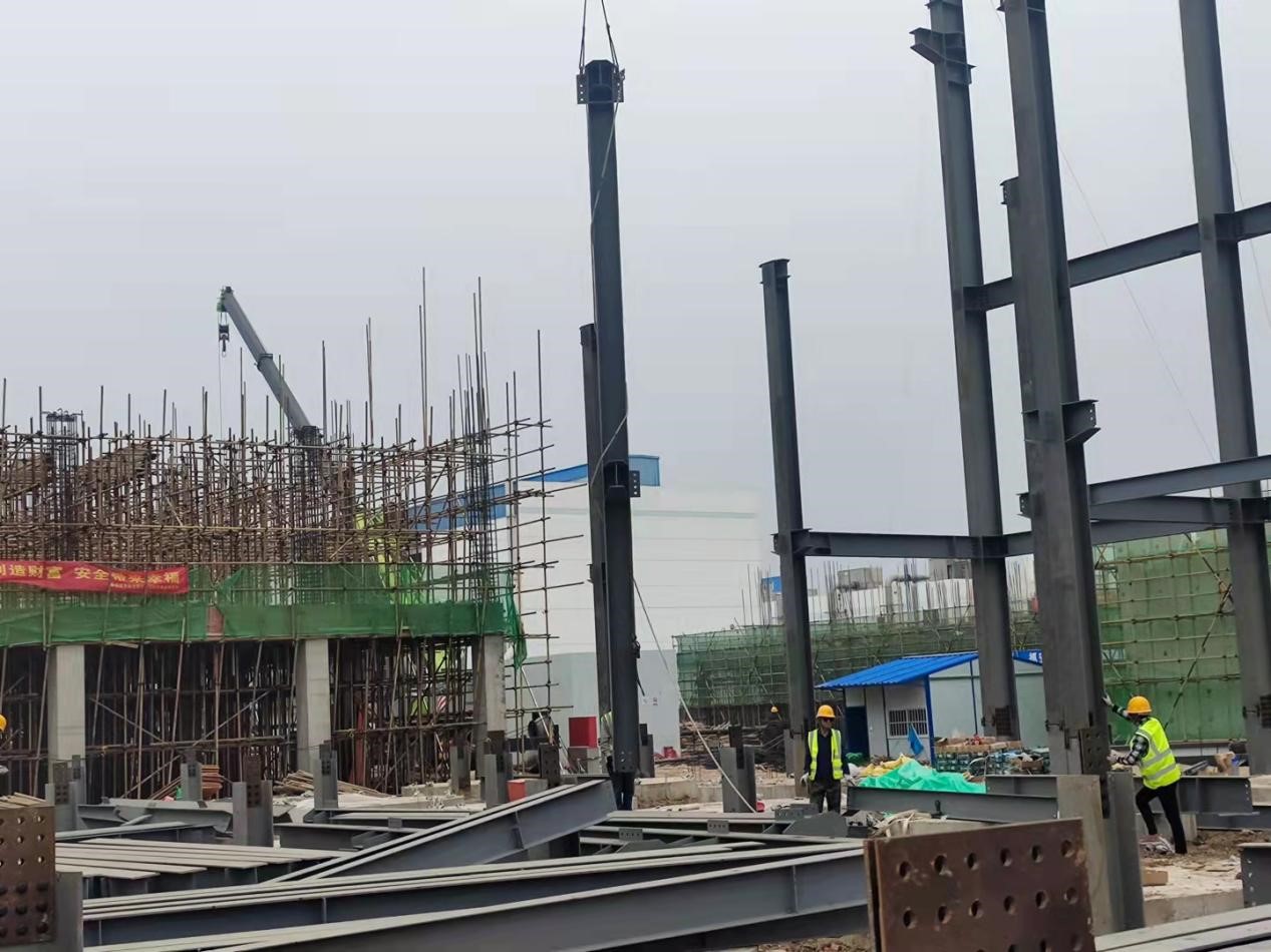 發(fā)酵車間C區(qū)鋼結構區(qū)域,吊裝作業(yè)正在如火如荼進行;B區(qū)滿堂腳手架緊張搭設,鋼筋工頂著烈日進行鋼筋綁扎,投料車間兩臺挖機聯(lián)動,進行管廊支架基礎基坑開挖,控制車間正在忙忙碌碌進行內墻二次結構砌筑。各個車間有條不紊的忙碌著,整個項目現(xiàn)場一片火熱,迅速掀起“比、學、趕、幫、超”施工高潮!