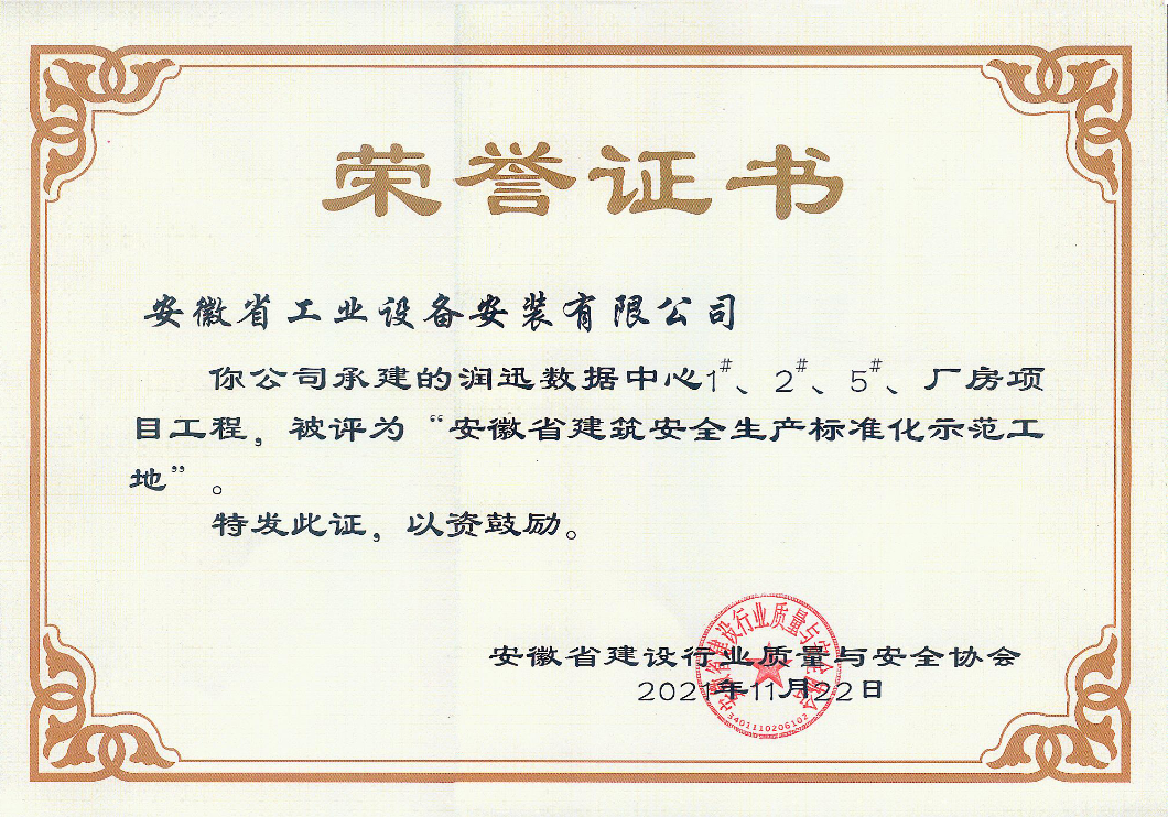 近日,安徽省工業設備安裝有限公司承建的潤迅數據中心1#、2#、5#廠房項目工程榮獲2021年度“安徽省建筑安全生產標準化示范工地”榮譽稱號。
