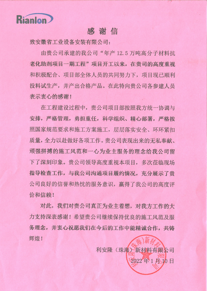 近日,利安?。ㄖ楹#┬虏牧嫌邢薰鞠虬不瞻惭b公司致感謝信,對安徽安裝公司“年產12.5萬噸高分子材料抗老化助劑項目一期工程”實現順利投產運行產出合格產品表示祝賀,對項目部全體參建人員付出的艱辛努力與貢獻給予感謝。