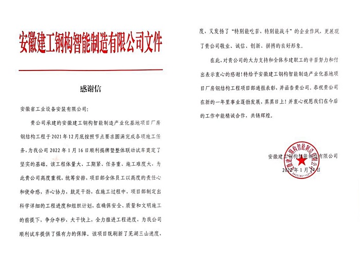 近日,公司安徽建工鋼構智能制造有限公司廠房鋼結構工程項目收到業主單位安徽建工鋼構智能制造有限公司感謝信,信中對建工鋼構廠房鋼結構工程項目部在工程施工中的辛苦努力和突出表現表達了高度贊譽和衷心感謝!