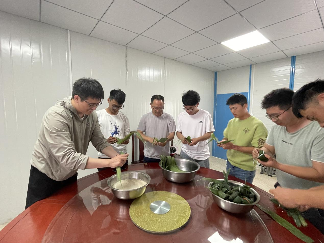 富有經(jīng)驗的彭韋銘耐心細致地為大家講解了疊粽葉、填料、捆扎等包粽子的詳細流程。大家在一片歡聲笑語中開始了包粽子活動,將粽葉做成漏斗狀,填上糯米,壓實封口,最后捆扎。盡管大部分人都是第一次包粽子,但是大家熱情高漲,每個人包的粽子都有自己的特色。香噴噴的粽子,歡快的活動,緊張的生產(chǎn),使單調(diào)的工地生活增添了色彩。
