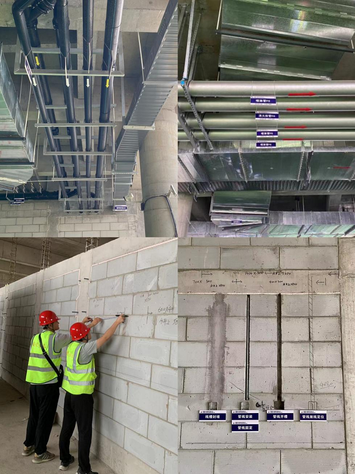 在施工過程中,項目黨員技術攻關小組還積極開展技術申報和創優爭先活動。在預留預埋階段結合現場實際,及時下達QC立項計劃,不斷挖掘課題,積極推廣先進質量管理方法和經驗,充分發揮小組成員的集體智慧,并獲得省級QC成果一等獎。在“質量月”活動過程中,項目部組織施工管理人員認真學習規范標準及二維碼的制作、展示方法,并開展機電安裝工藝細部做法的學習交流,在總結經驗的基礎上,已編寫出3項施工工法,其中2項已獲得集團企業級工法。
