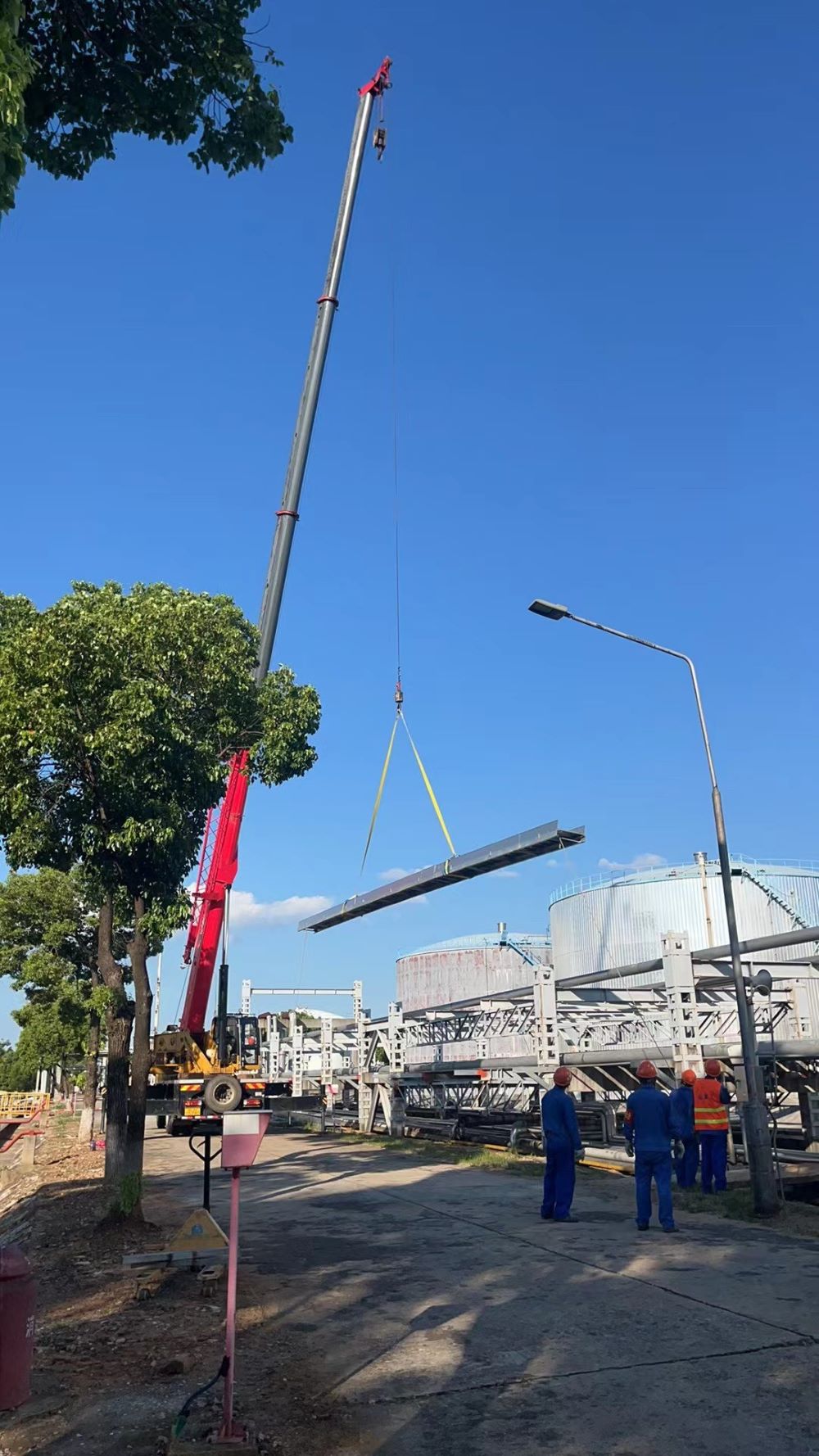 8月1日,該項目進行電纜槽盒托架吊裝工作,該電纜槽盒托架采用18米每段進行吊裝,先集中預制后到現(xiàn)場管廊處進行對接后在吊裝至管廊上。該托架重量約0.6噸,使用1臺25噸吊車,將整段托架吊至上方,并對接安裝連接成一個整體。在項目部全體人員的共同努力下托架順利吊裝到位,該托架吊裝完成標志著此項目安裝工作進入尾聲,為項目按時完工奠定了良好的基礎,目前正在進行電纜橋架吊裝和電纜鋪設工作。