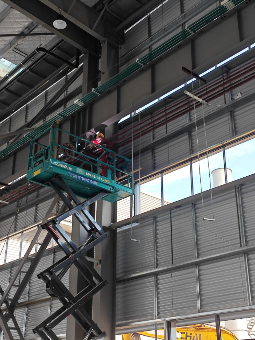 建工安裝合肥分公司施工內容涉及2#重鋼車間主次構安裝、圍護系統、門窗、防火涂料、通風氣樓和機電安裝工程(裝飾裝修、工藝管線、消防、給排水、電氣、通風空調等)。為保質保量完成施工任務,分公司派駐分管領導現場駐點,項目管理團隊日夜跟進,施工人數達到100多人,曲臂車、登高車等各種現場施工機械達60余輛。本項目留給機電安裝工期緊任務重,項目全體人員日夜奮戰,最終刷新15日大面完工耀眼戰績,為基地順利投產奠定堅實基礎。
