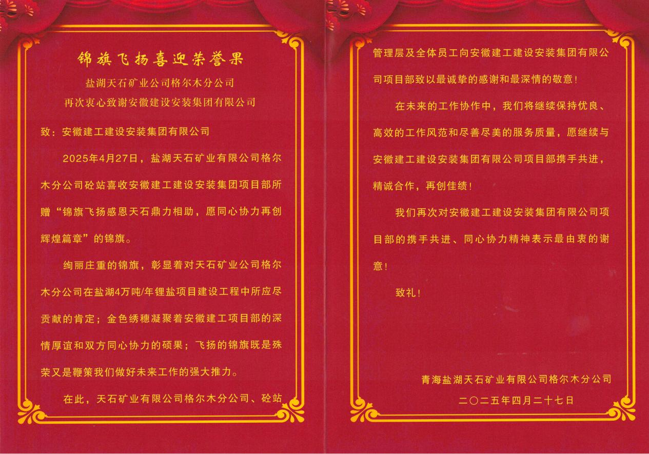 信中,青海鹽湖天石礦業有限公司格爾木分公司對建工安裝項目部此前慰問砼站全體員工致以最誠摯的感謝,愿繼續與建工安裝項目部攜手共進、精誠合作、再創佳績!這封感謝信不僅是對項目部過往成績的肯定,更是一份振奮人心的激勵。建工安裝將繼續保持高昂斗志和嚴謹態度,加強與相關單位溝通協作,強化項目管理,確保項目按期、高質量交付,為打造世界級鹽湖提鋰產業基地貢獻力量!