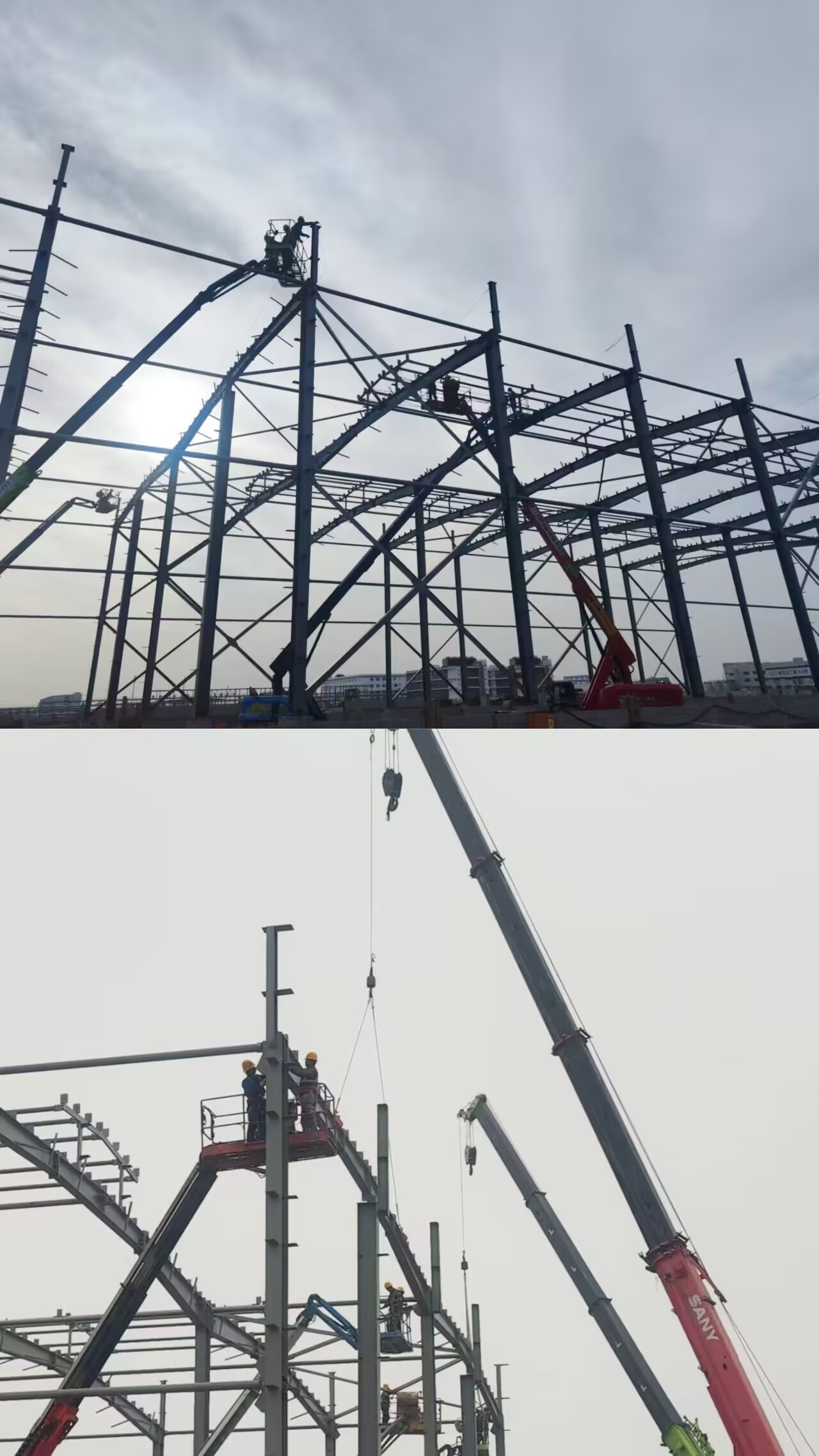 走進(jìn)項(xiàng)目施工現(xiàn)場(chǎng),起重機(jī)揮動(dòng)著粗壯的鋼鐵臂膀劃破天際,將一段段鋼梁精準(zhǔn)的吊裝至安裝位,曲臂車托舉著工人將鋼構(gòu)件嵌入到預(yù)定位置,保障高空作業(yè)人員的生命安全。這是力量與技術(shù)的二重奏,更是安全與效率的完美平衡,一幅現(xiàn)代工業(yè)建筑的壯美畫卷正徐徐展開。